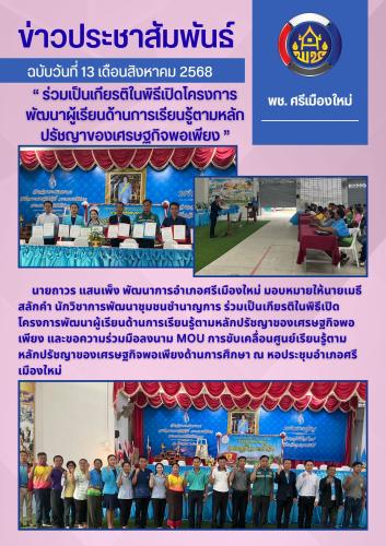 พช.ศรีเมืองใหม่ ร่วมเป็นเกียรติในพิธีเปิดโครงการพัฒนาผู้เรียนด้านการเรียนรู้ตามหลักปรัชญาของเศรษฐกิจพอเพียง และร่วมมือลงนาม MOU ฯ